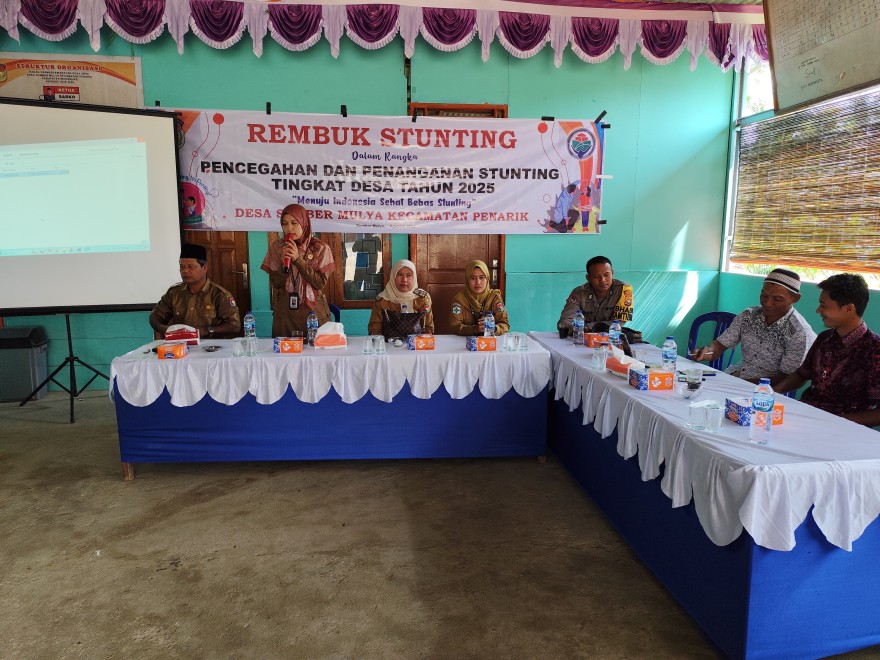 sumbermulya-penarik -- Senin, 2 September 2024 Desa Sumber Mulya menggelar rembuk stunting. Rembuk stunting merupakan salah satu rangkaian kegiatan penyusunan Rencana Kerja Pemerintah (RKP) Desa tahun 2025, juga menjadi amanat Pemerintah terhadap pemerintah desa agar memprioritaskan penggunaan Dana Desa untuk pencegahan dan penanganan stunting. Pelaksana dari rembuk stunting desa yaitu Kader Pembangunan Manusia (KPM). Adapun acara rembug stunting desa dihadiri oleh Camat Penarik, Kepala Desa dan Perangkatnya, Ketua BPD dan Anggotanya, Tim dari Puskesmas Penarik, Penyuluh KB, Kader Posyandu Desa, para Ketua RT, Kader PAUD, TP. PKK Desa, Karang Taruna, Pendamping Desa dan perwakilan masyarakat lainnya.
